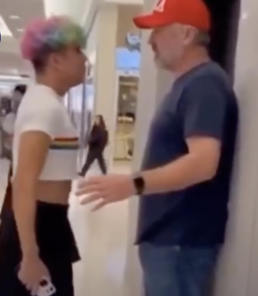 The video shows a tense argument over the use of public restrooms and the limits of privacy. In the footage, a young man who identifies as gay tries to enter the women’s restroom, but another man blocks his way, explaining that his wife is inside at that moment, creating an uncomfortable confrontation in front of several witnesses.