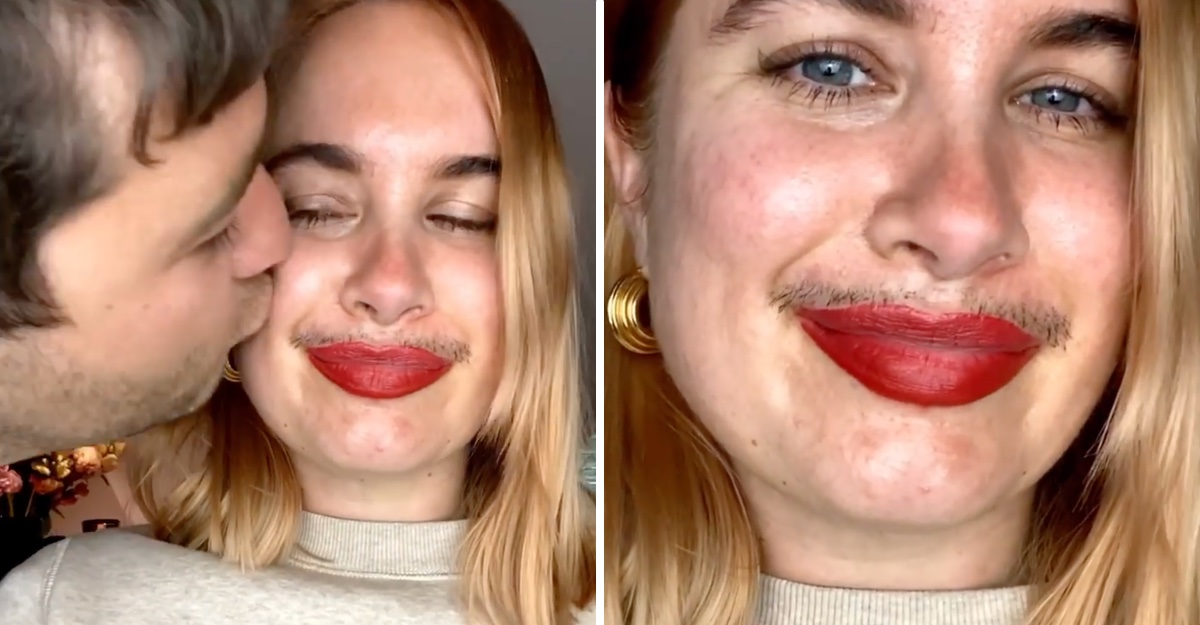 Como respuesta ante estas críticas, ella luce su pequeño mostacho y lo adorna con un poco de rimel para que este se note más. Además de ostentar una reluciente sonrisa, muestra cómo su marido lo aprueba, pues él aparece y le planta un beso en su mejilla.