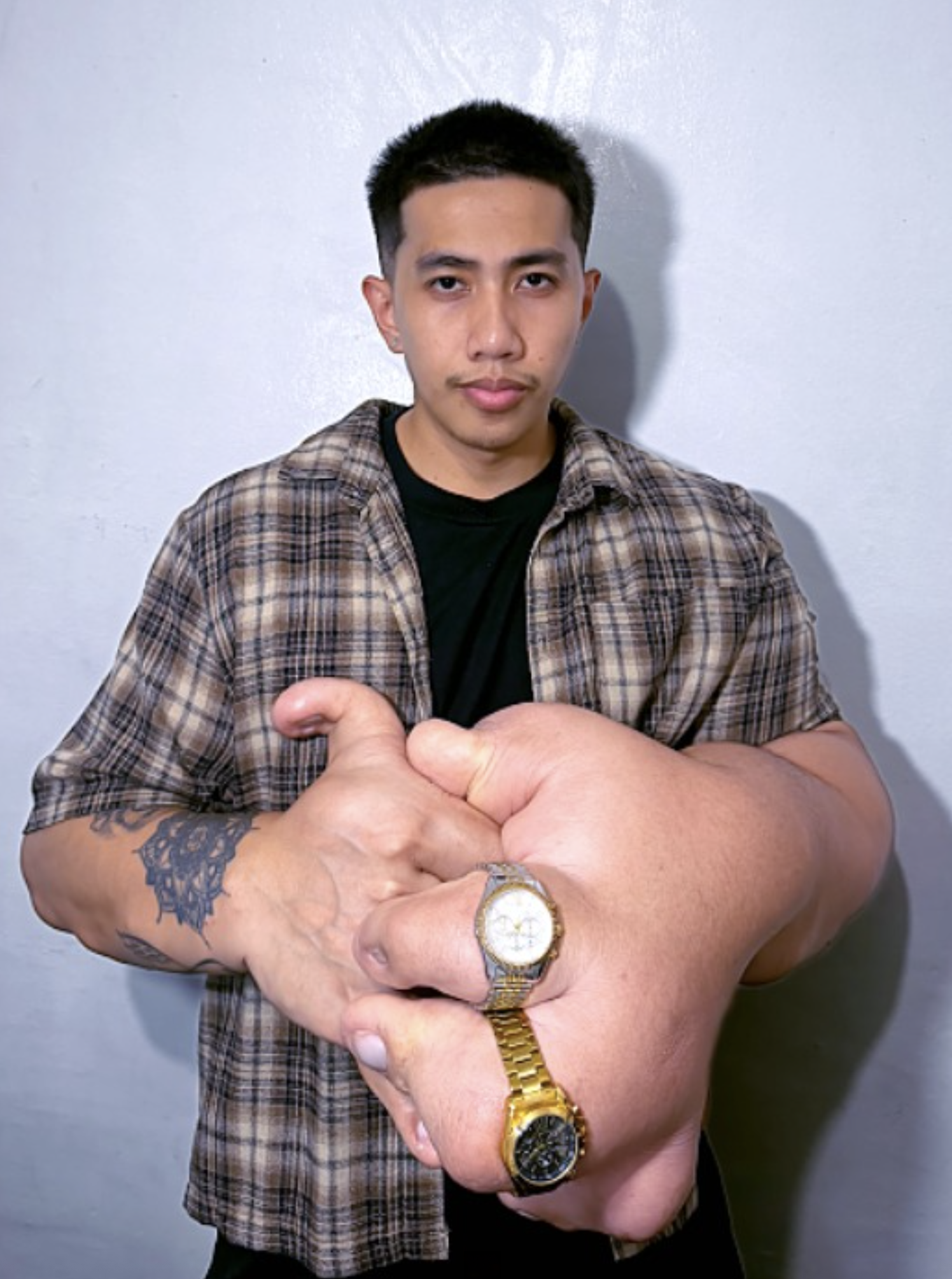Este creador de contenido filipino nació con macrodactilia, una rara condición que provoca el crecimiento excesivo de los dedos. En su caso, el tamaño de sus manos es mucho mayor al promedio, algo que desde pequeño marcó su vida y la forma en que los demás lo veían.
